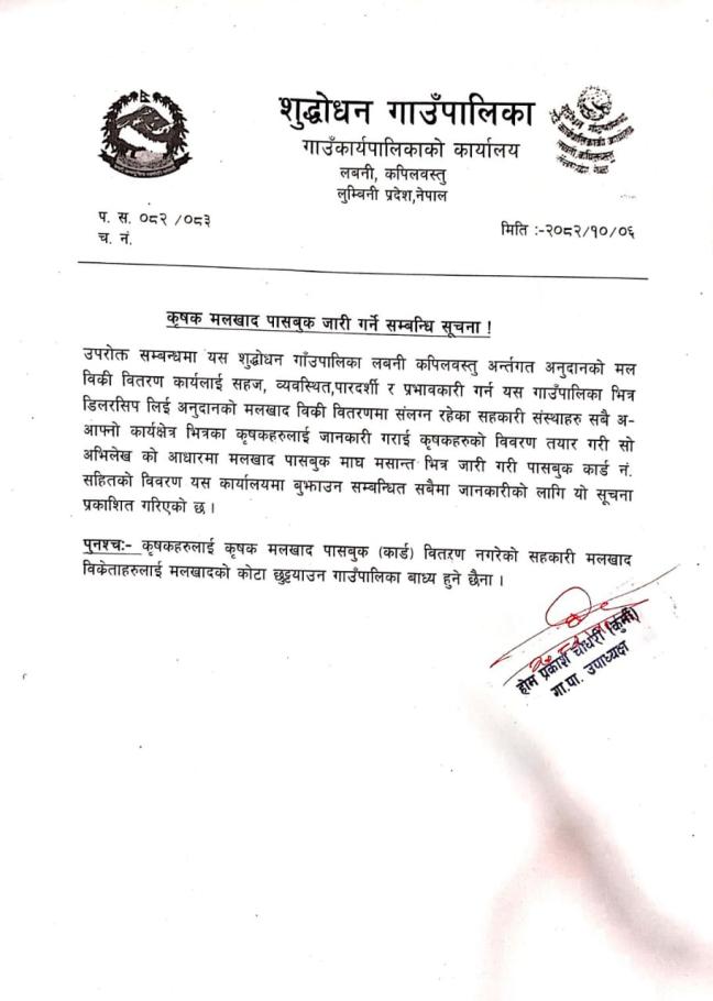 कृषक मलखाद पासबुक जारी गर्ने सम्बन्धी सूचना |